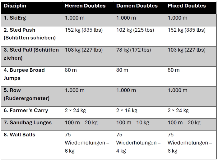 HYROX ist ein einzigartiger Fitnesswettkampf, der Ausdauer und Kraft gleichermaßen fordert. Teilnehmende absolvieren acht Laufabschnitte à 1 Kilometer, die sich mit acht funktionellen Workouts abwechseln in folgender Reihenfolge: