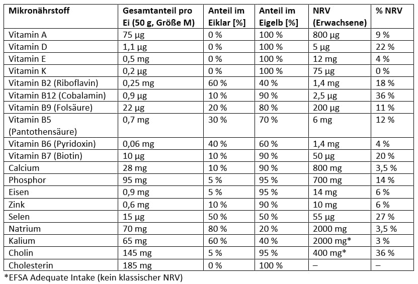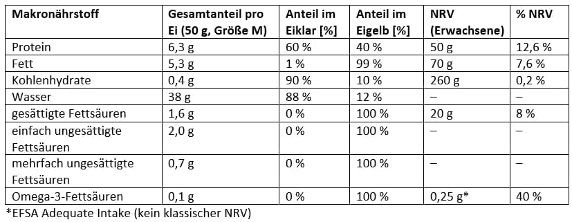 Folgend dargestellt sind die Makronährstoffe eines durchschnittlichen Hühnereis der Größe M (ca. 50 g) aus Bodenhaltung. Die NRV (Nutrient Reference Values = Nährstoffbezugswerte) geben dabei Mindestreferenzen für die tägliche Nährstoffzufuhr an (keine Optimalversorgung).